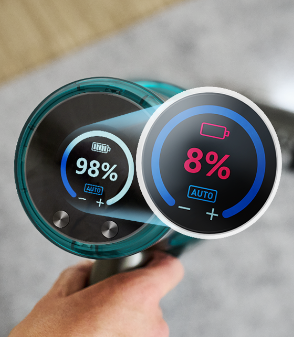 Modul AUTO detectează automat murdăria și asigură o putere optimă de aspirare, cu eficiență maximă a bateriei. Controlul prin senzori din adaptor permite utilizarea reglajului puterii de aspirare pentru toate accesoriile electrice.