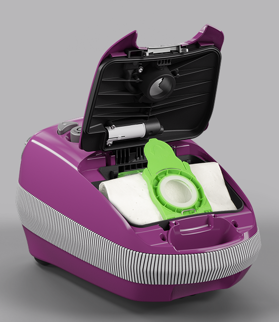 Cu o rază de operare de 10,8 metri, practic nimic nu rămâne inaccesibil cu SEBO AIRBELT E1 PURPLE. Printr-o simplă apăsare de buton, cablul de alimentare se retrage automat.