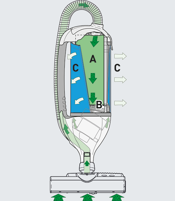 Suprafața cu design elegant ascunde tehnologia avansată de filtrare SEBO S-Class. Suprafața foarte mare distribuie uniform aerul curat și reduce zgomotul motorului.